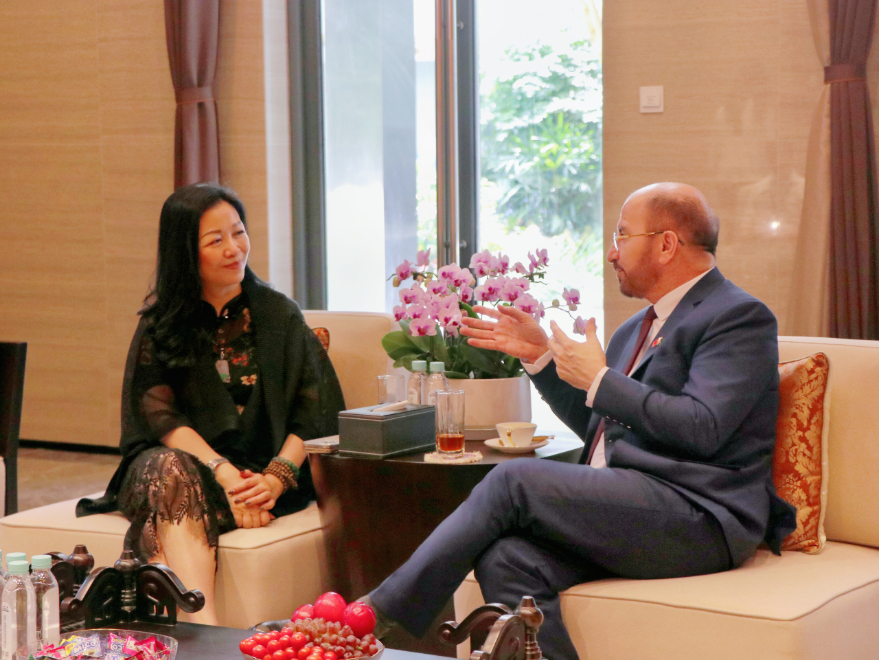 查看詳情5月9日下午,馬來西亞駐南寧總領(lǐng)事館總領(lǐng)事阿哈默·法蒂爾·伊斯邁爾、馬來西亞駐廣州總領(lǐng)事館商務(wù)領(lǐng)事哈里斯一行到訪中國—東盟特色商品匯聚中心,實地調(diào)研項目的發(fā)展情況。中國—東盟特色商品匯聚中心董事長趙海燕熱情接待領(lǐng)事們一行。