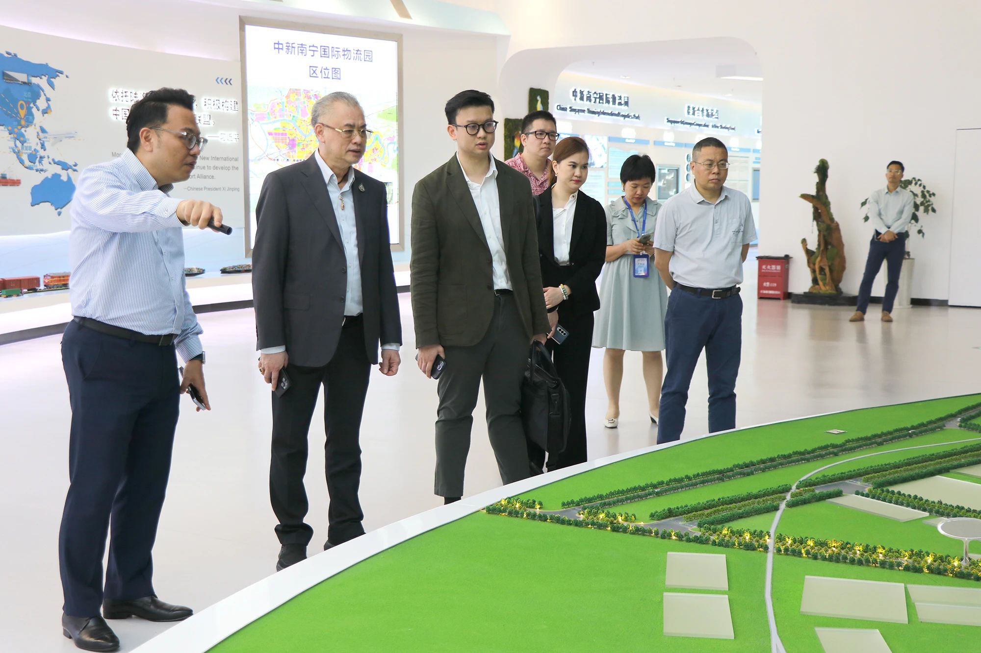 在中新物流園展示中心,考察團(tuán)一行深入了解項(xiàng)目的整體情況。作為國(guó)際陸海貿(mào)易新通道上重要的物流樞紐節(jié)點(diǎn)項(xiàng)目之一,園區(qū)堅(jiān)持以“強(qiáng)中選強(qiáng),優(yōu)中選優(yōu)”重點(diǎn)引進(jìn)大型物流龍頭企業(yè)為招商理念和工作方針,目前已引進(jìn)超30家世界500強(qiáng)和中國(guó)100強(qiáng)龍頭企業(yè)進(jìn)行合作,共同實(shí)施項(xiàng)目建設(shè)和運(yùn)營(yíng)。同時(shí),為能更好地?fù)屪CEP新發(fā)展機(jī)遇,中新物流園與時(shí)俱進(jìn)不斷創(chuàng)新,于2021年聯(lián)合中國(guó)—東盟博覽會(huì)秘書(shū)處共同打造了獨(dú)具特色的匯聚中心,通過(guò)線上數(shù)字化平臺(tái)+線下展館沉浸式商貿(mào)體驗(yàn)相結(jié)合的方式,致力于搭建一個(gè)中國(guó)與東盟、RCEP其他區(qū)域國(guó)家乃至“一帶一路”沿線重要國(guó)家線上線下經(jīng)貿(mào)往來(lái)的一站式首選平臺(tái)。