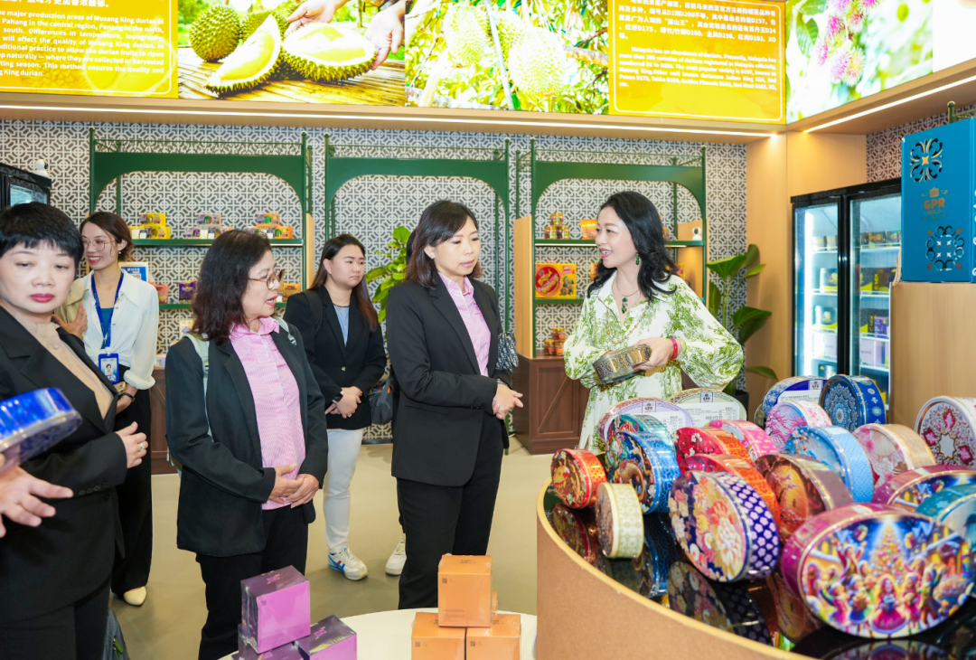 來到馬來西亞館,各類富有當?shù)靥厣娜宋娘L俗與“僑元素”生動呈現(xiàn):從標志性的雙子塔、五大經(jīng)濟走廊,到傳統(tǒng)巴迪布、高腳屋和榴蓮樹造景,無不喚起代表團的熟悉與親切之感。館內還陳列了燕窩、巧克力、白咖啡等特色商品,進一步增強了實地體驗的氛圍。大家紛紛就館內已入駐商品的運營推廣情況,進行詳細的了解和探討。在得知各館均有相應館長對商品進行管理與推介時,代表團更是稱贊連連。