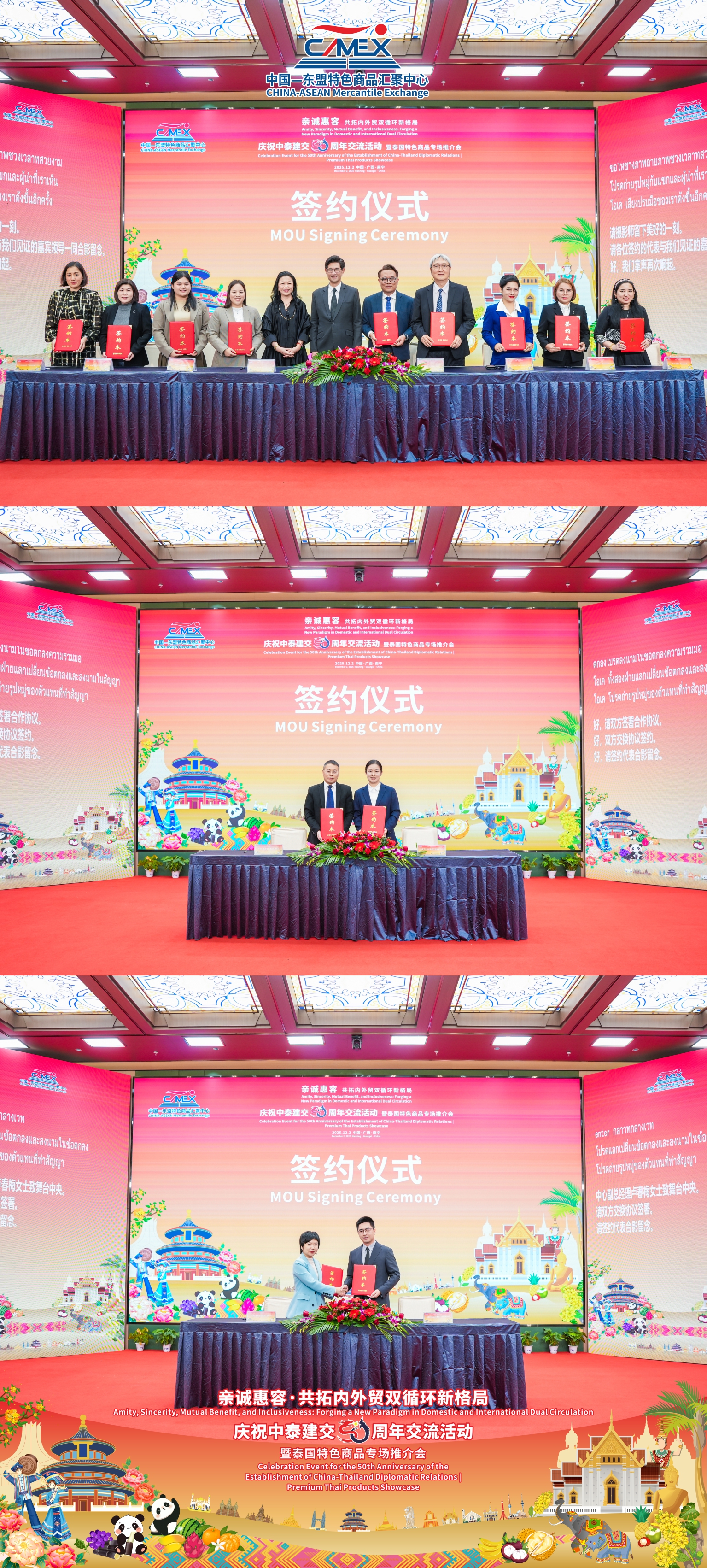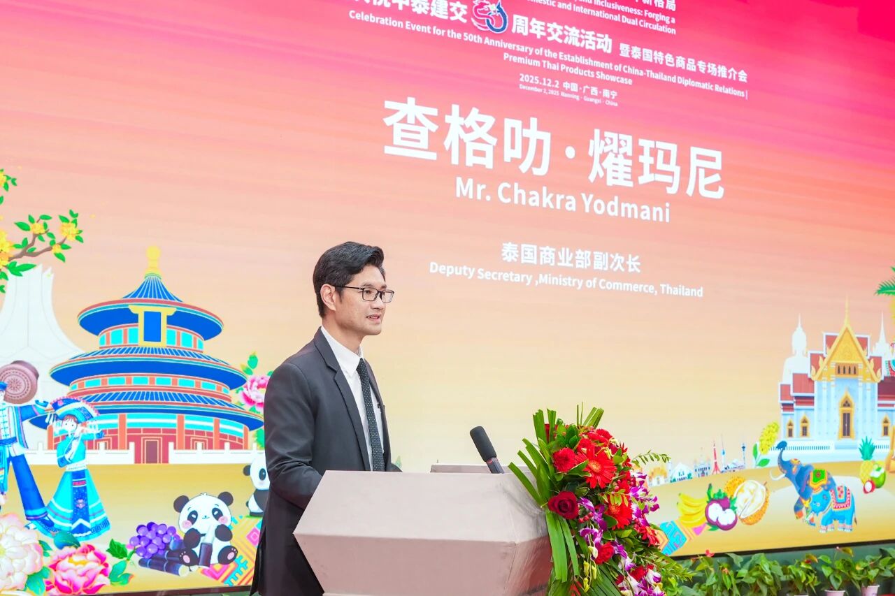 12月2日,“親誠惠容·共拓內(nèi)外貿(mào)雙循環(huán)新格局——慶祝中泰建交50周年交流活動暨泰國特色商品專場推介會”在中國—東盟特色商品匯聚中心隆重舉辦。本次活動由泰國商業(yè)部、泰國商業(yè)部國際貿(mào)易促進司、中國國際貿(mào)易促進委員會廣西壯族自治區(qū)分會、中國—東盟商務(wù)理事會聯(lián)席秘書處、中國—東盟特色商品匯聚中心(簡稱“匯聚中心”)聯(lián)合主辦,中國國際商會廣西商會、中國檢驗認證集團廣西有限公司、廣西達譯科技有限公司、邁越科技股份有限公司、方圓標志認證集團廣西有限公司作為支持單位參與此次活動。