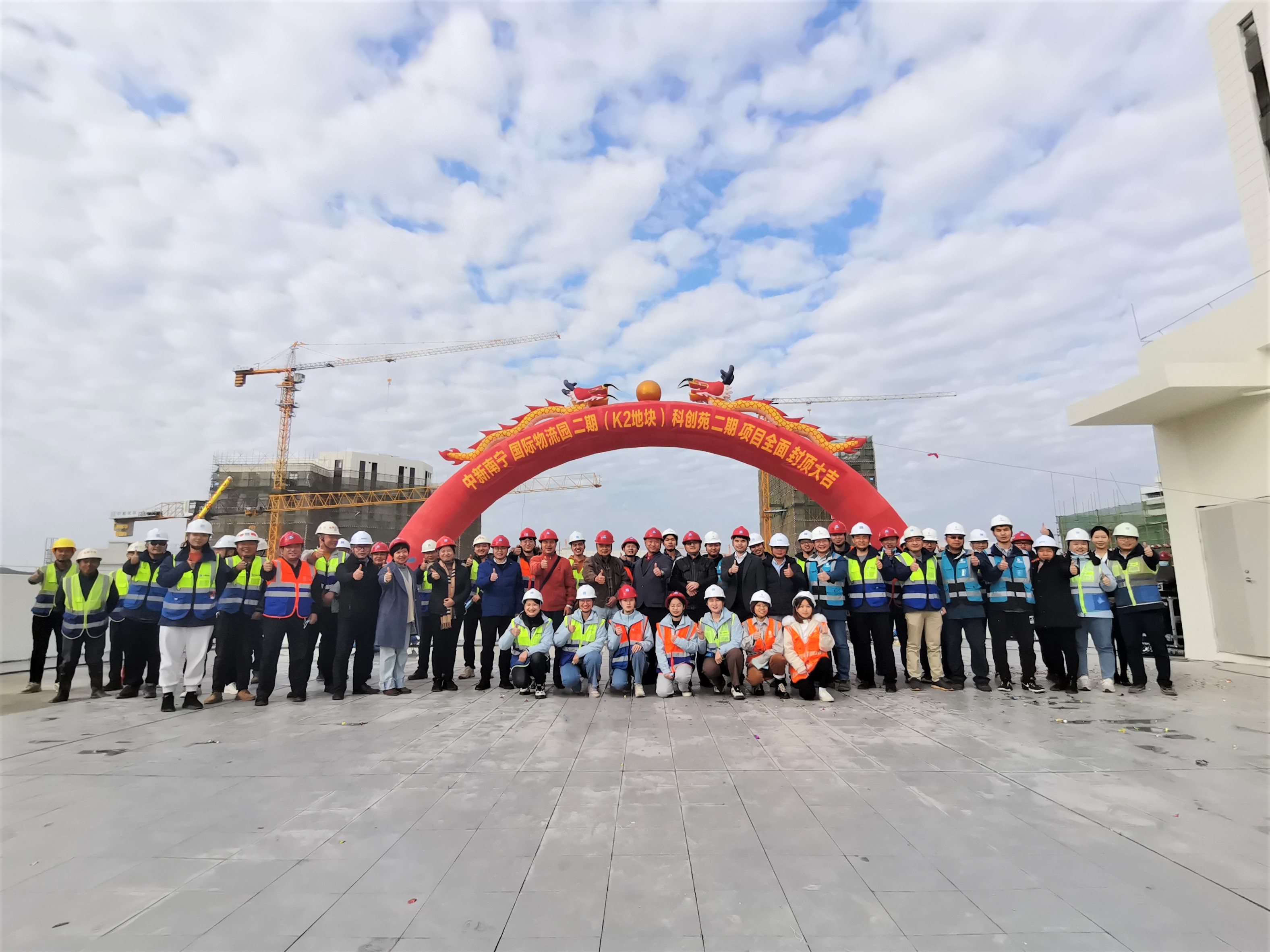 2022年1月11日,中新南寧國際物流園(以下簡稱“中新園”)二期(K2地塊)科創(chuàng)苑二期項(xiàng)目全面封頂,標(biāo)志著中國—東盟特色商品匯聚中心的產(chǎn)業(yè)規(guī)劃施工工程進(jìn)入新的階段。南寧綜保區(qū)管委會、廣西新中產(chǎn)業(yè)投資有限公司、項(xiàng)目工程施工總包方和各參建方共同參加了此次封頂儀式。